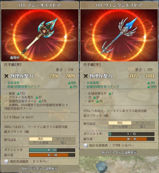左が復帰後に新造した武器になります。攻撃力は旧武器の方が高いんですけど、これも、TOS独特?の超越というシステムを用いると、あら不思議アッというまにマシニオススピアの攻撃力が上昇するので、現状では4000程度ですかね。なので、旧武器との差は大よそ300はある事になります。この数字が大きいのか?はたまた小さいのかはよく分かりませんが、この手のゲームって武器や衣装が変わるとモチベーションが上がる気がするのです。単に視覚的な問題なのかもだけど・・・(涙