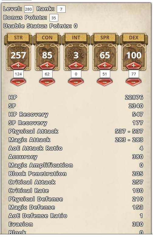 ドッペルというと、巷では「これが本当の直接火力ですよ!」といったビルドが有名かもしれませんが、今回参考にさせてもらったのは、ハイランダー3クラスからバーバリアン1クラス取ってドッペルという流れのビルドになります。ステ振りは最近流行りのDEX方ではなく、バランス型ですね。ただ、テンプレの物よりも若干DEXに比重を移しています。クリティカル発生率と同ダメージを出来るだけ両立させたかったですので。SPRに結構振ってるんですけど、スキルを連打する職ですし、ブロック貫通や魔法防御等の恩恵を得ることが出来るので、沢山振ってます。