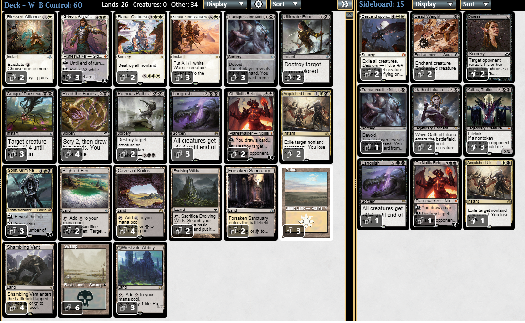 後の更新点は衰滅を1枚減らしたり、リリアナの誓いをメインに2枚盛り込んだり、